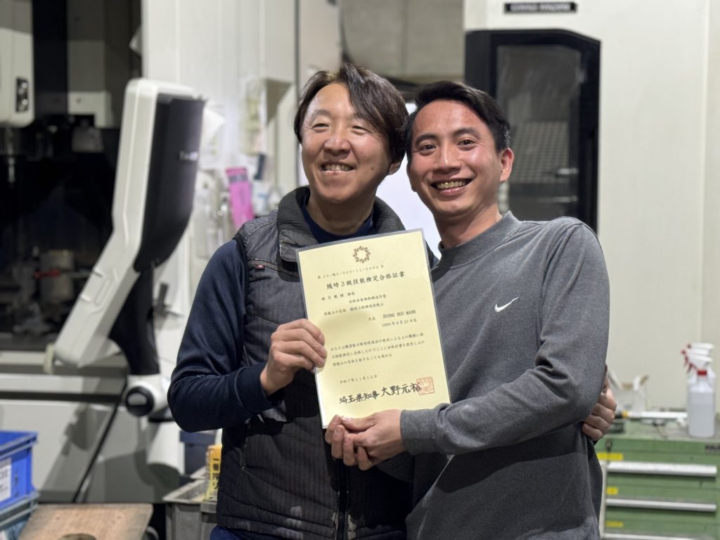 今回も山本工機入社3年目の実習生が3級技能検定に合格しました。
